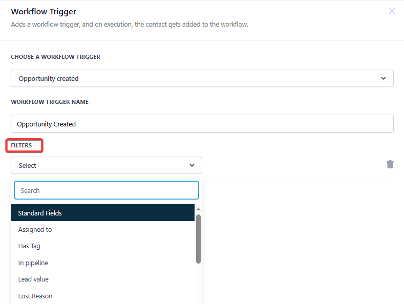 Question: Can I filter when the “Opportunity Created” trigger should activate? Answer: Yes, you can add filters to specify when the workflow should run. Filters include ‘Assigned to,’ ‘Has Tag,’ ‘In Pipeline,’ ‘Lead Value,’ ‘Status,’ and other custom fields for opportunities or contacts.