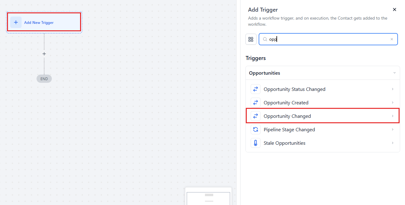 Question: How do I set up an “Opportunity Changed” trigger? Answer: To set up an “Opportunity Changed” trigger, go to Automation> Workflow, create a new workflow from scratch, and select ‘Opportunity Changed.’ You can add filters, define the actions, and save the workflow to automate responses to changes in existing opportunities.