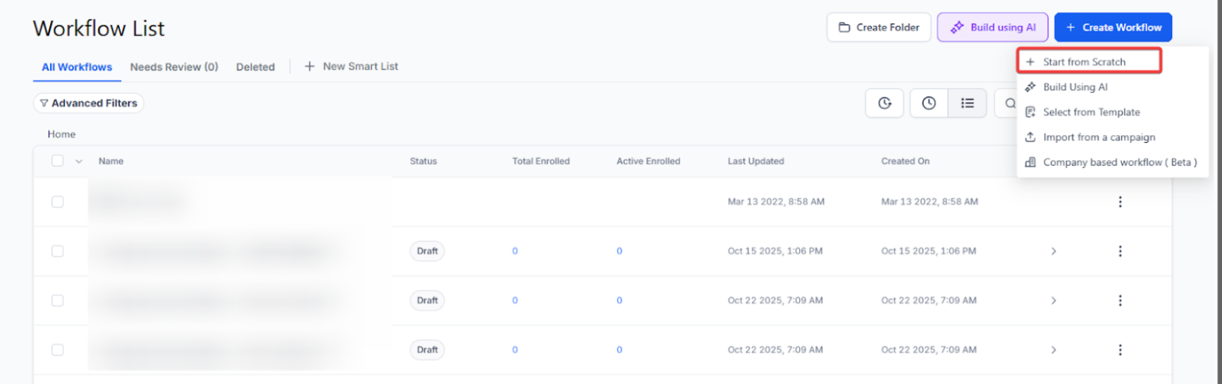 - Navigate to Automation> Workflow builder, click + Create Workflow, and click Start from Scratch