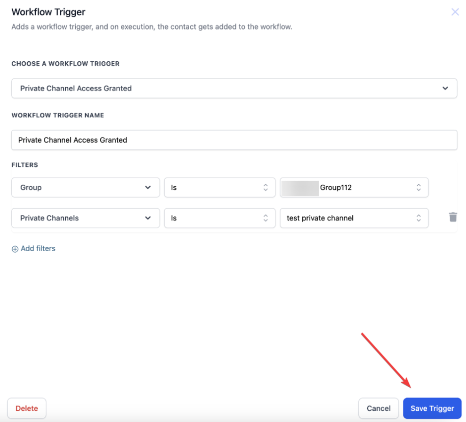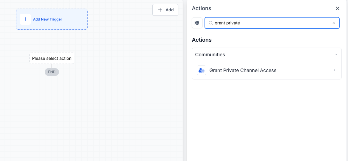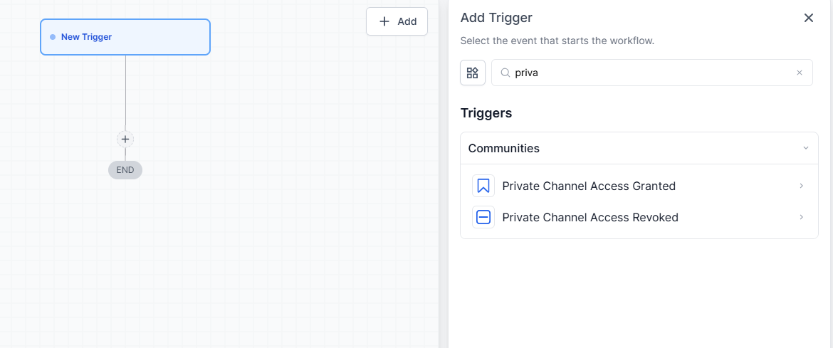 - Select “Add New Trigger” and choose either “Private Channel Access Granted” or “Private Channel Access Revoked.”