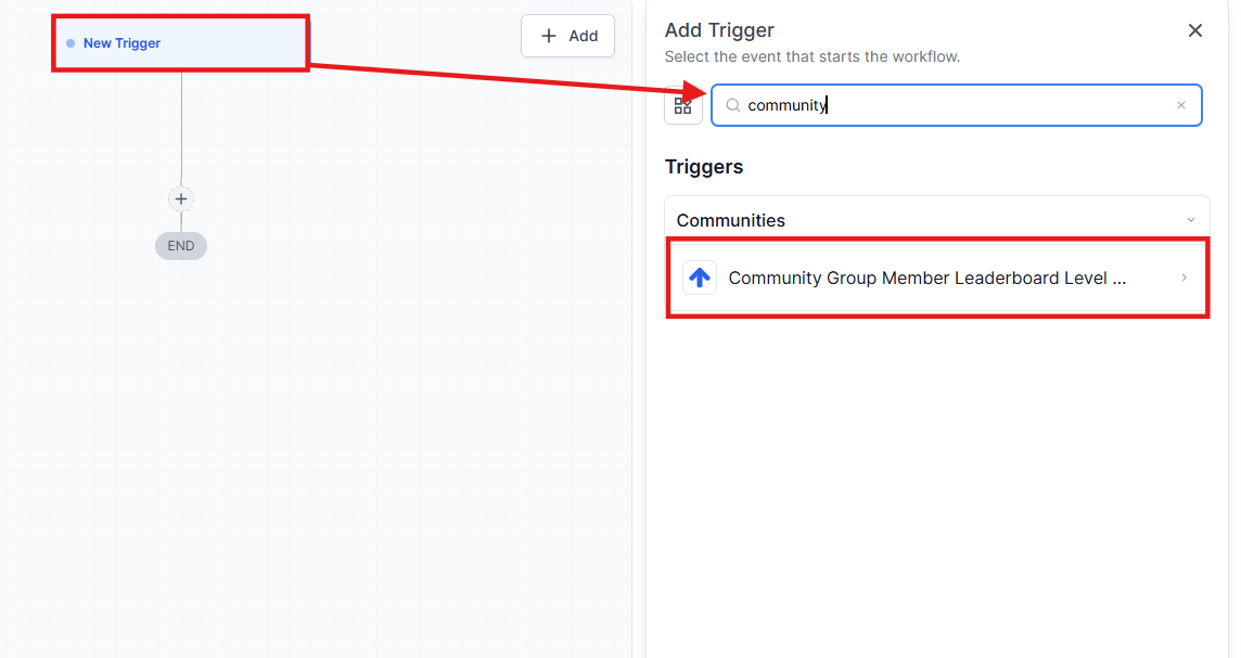 Section titled “How to Set Up Workflow Triggers and Actions”Step 1: Configure the “Community Group Leaderboard Level Changed” Trigger