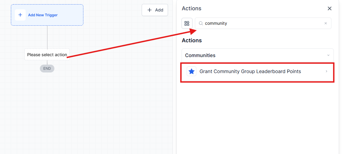 Section titled “Step 2: Use the “Grant Community Group Leaderboard Points” Action”1. Select the Action: Choose the “Grant Community Group Leaderboard Points” action to allocate points for specific activities.