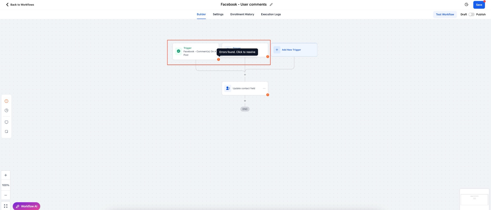 2. Visual Error HighlightingErrors are shown with a warning icon placed at the bottom right corner of the affected actions and triggers. These visual cues help you spot errors quickly within the workflow builder.