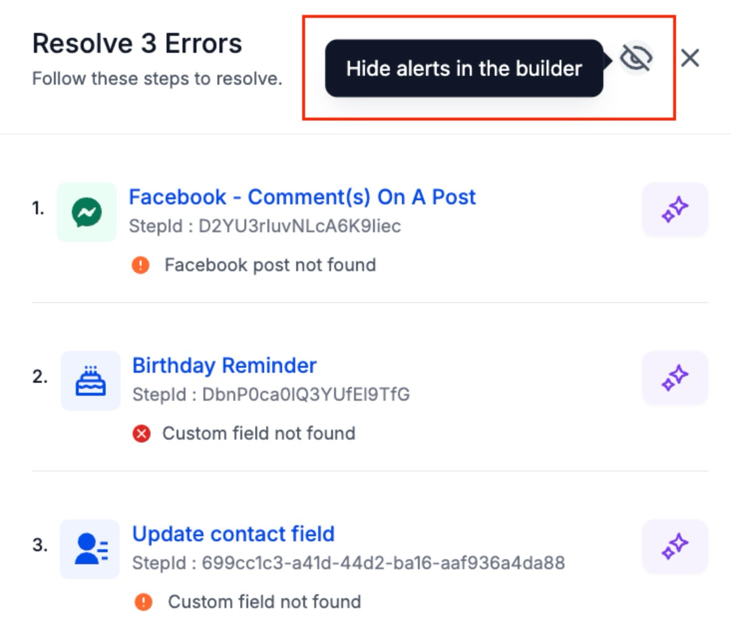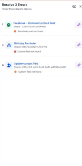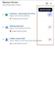 4. AI-Powered Error ResolutionThe AI Assistant provides detailed explanations for each error and suggests actionable steps to resolve them. A “Resolve through AI” button allows you to apply fixes directly with guidance from the AI Assistant. Clicking the button will open the sidebar for the specific action or trigger, where you can make the necessary adjustments.
