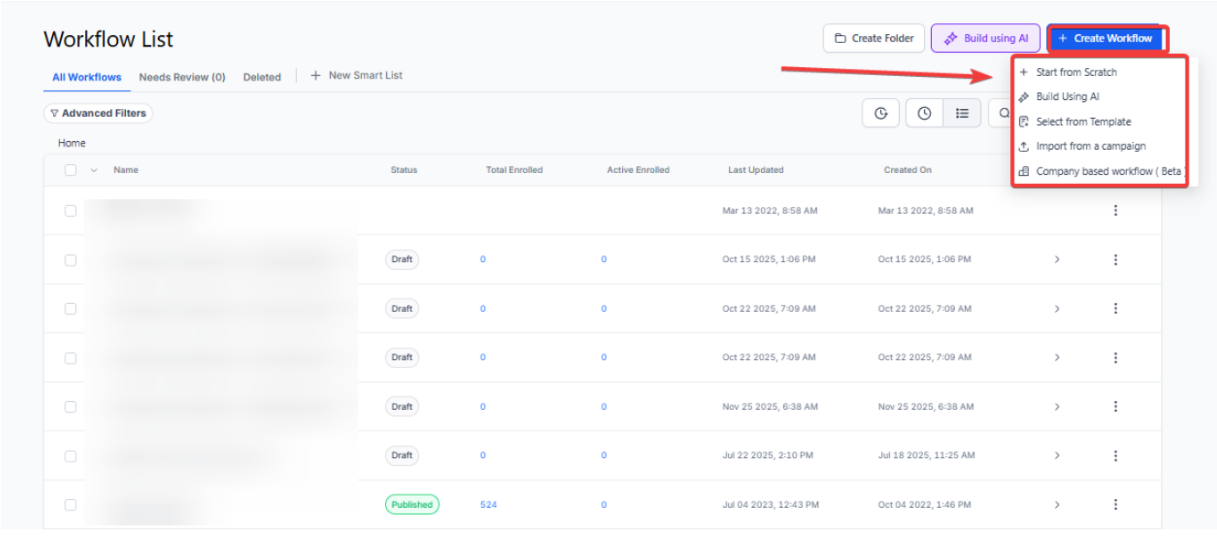 Section titled “Step 1: Access the Workflows List”- To begin, navigate to the Automation section in the main menu. This leads you to the Workflows tab, which displays drafted and published workflows.