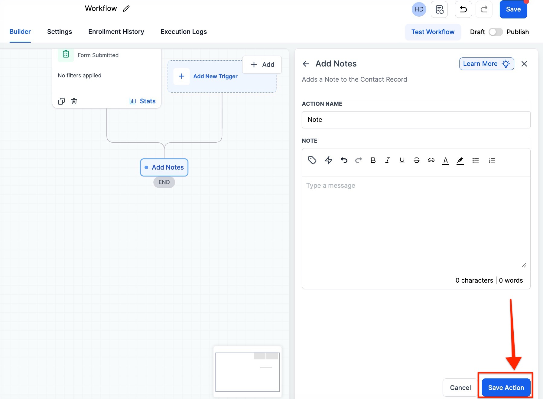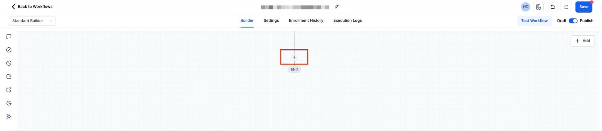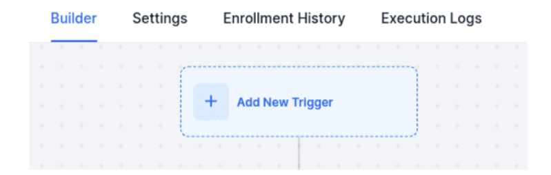 - Switch between the Builder, Settings, Enrollment History, and Execution Logs tabs to customize your workflow (each tab’s functionality will be detailed in separate guides).