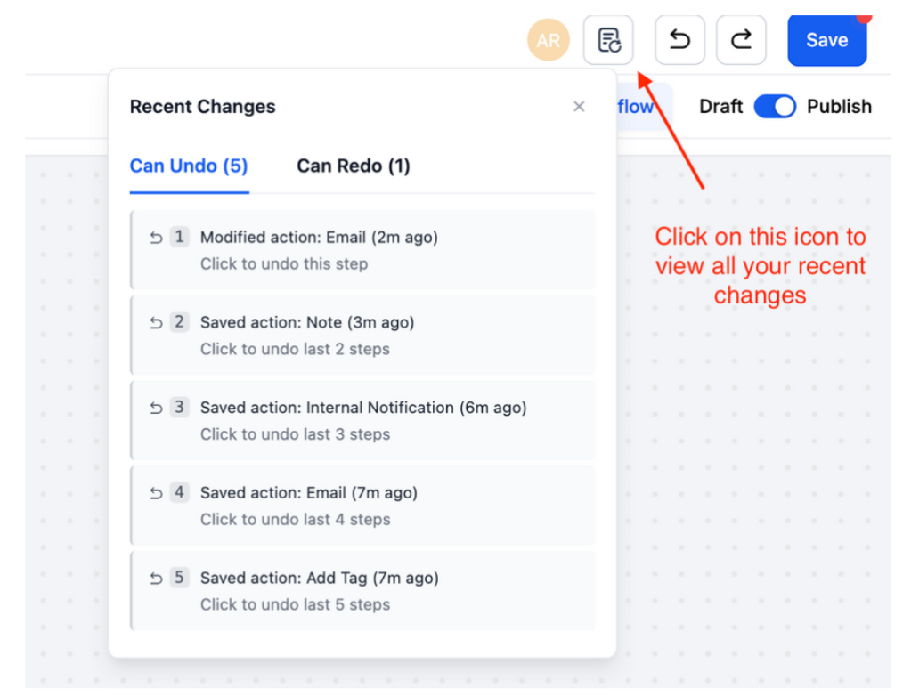 - The workflow builder includes Undo, Redo, and Change History tools for safer and faster editing. These let you easily reverse or reapply steps and view a full list of recent changes.