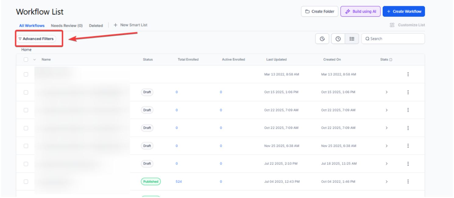 - Use the Filters section to choose between drafted, published, and paused workflows.