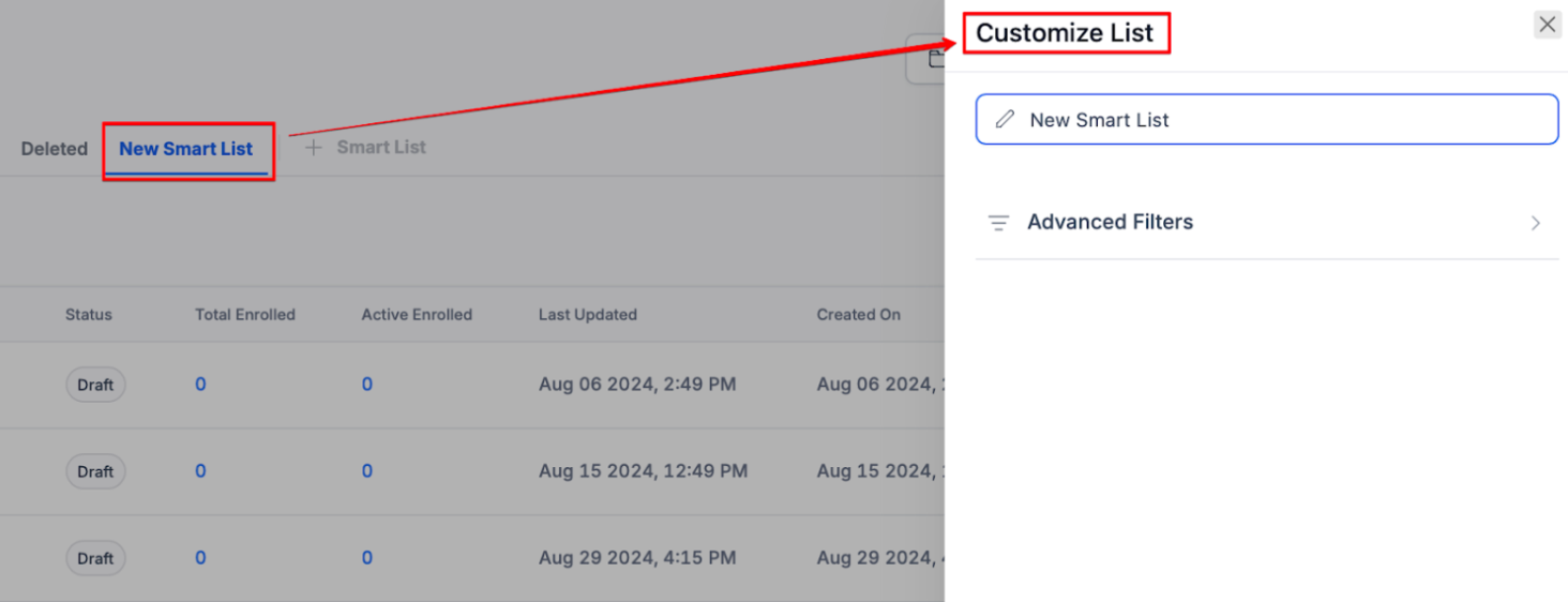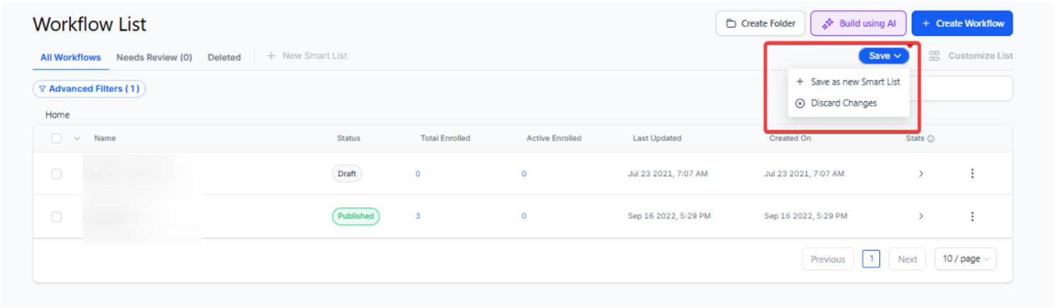 Section titled “Advanced Filters and Smart List”Advanced Filters and Smart List features in workflows allow you to apply multiple criteria to filter workflows and save custom views for quick access.