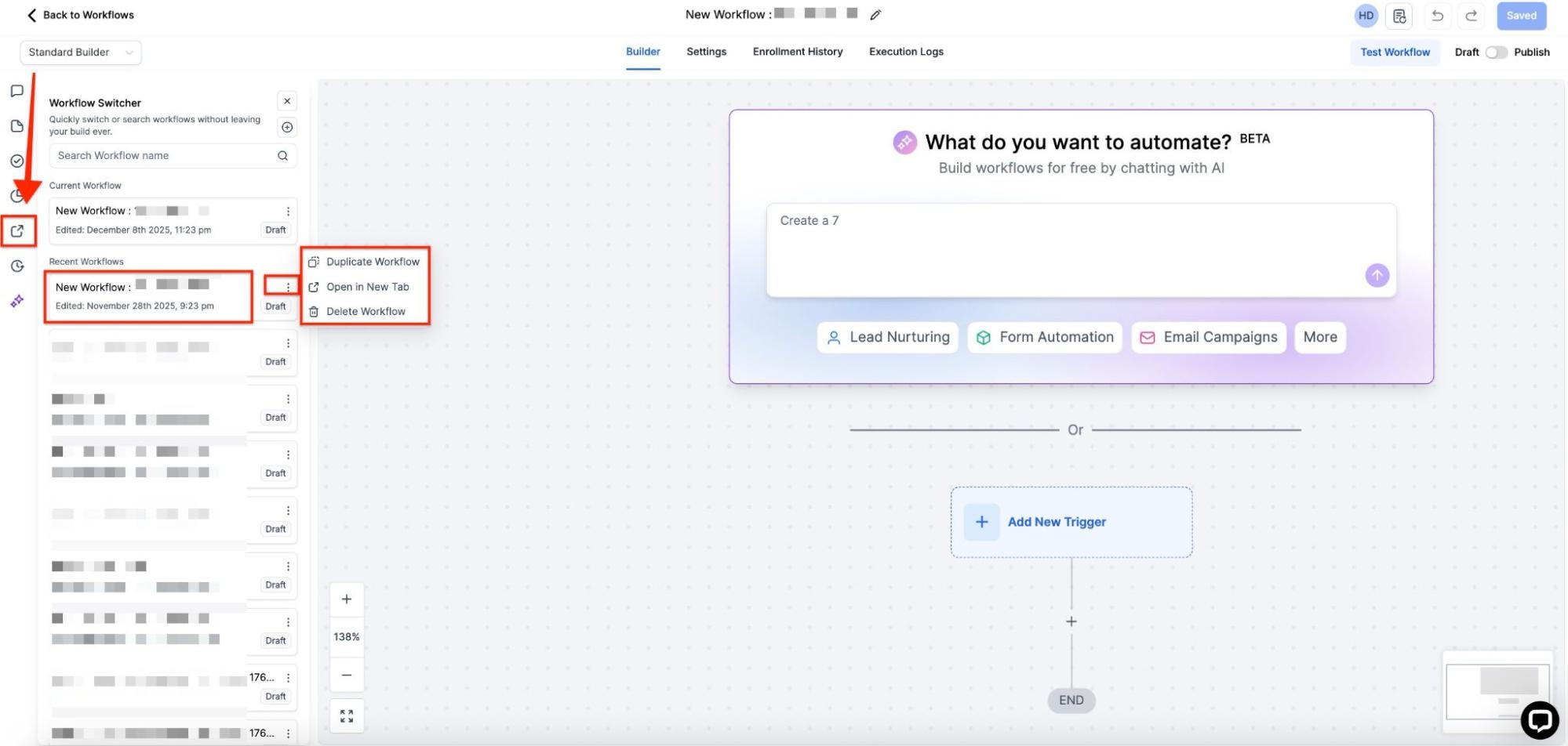- To enter the builder, click the + Create New Workflow button at the top right of the screen again.