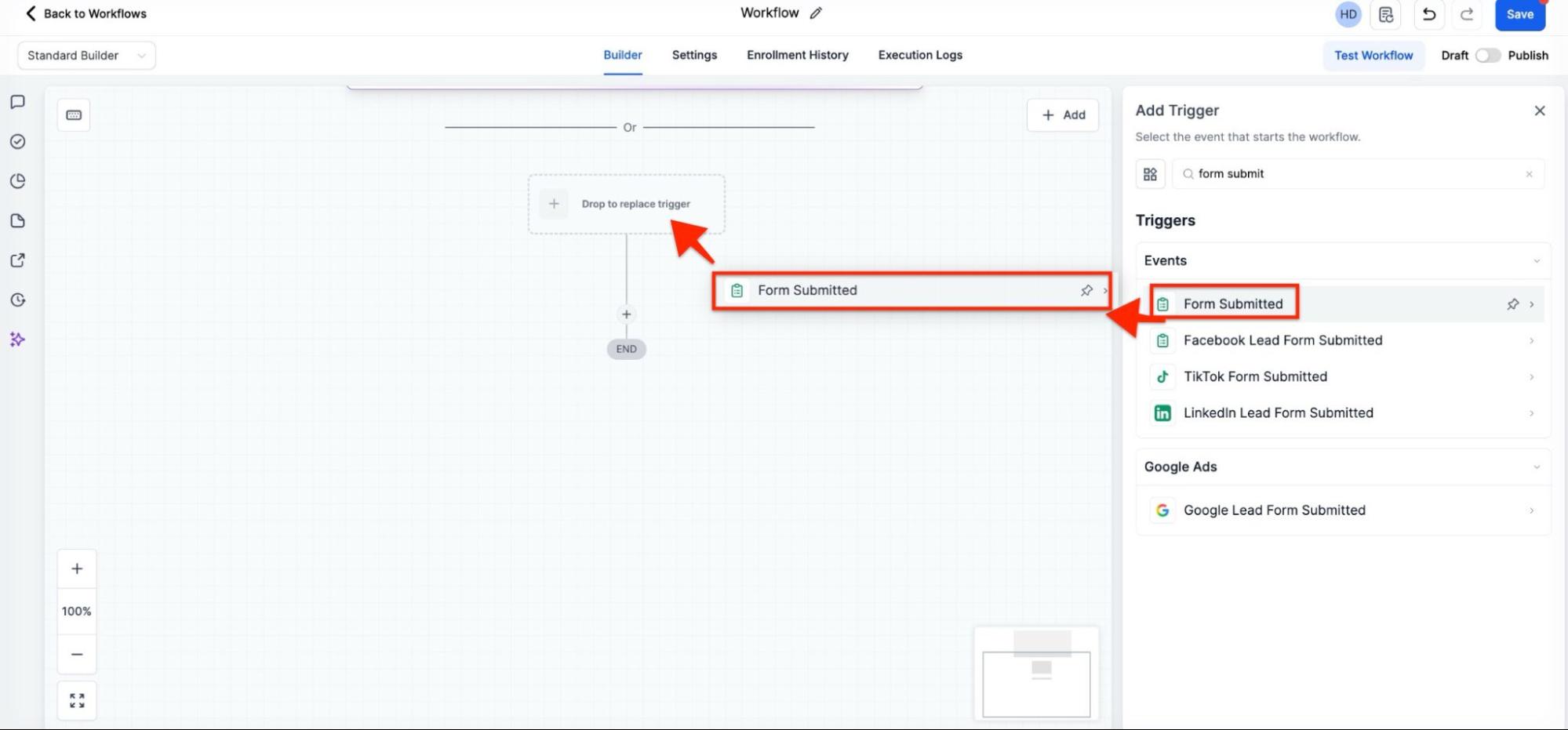 Drag-and-Drop Entry: You can also intuitively add triggers by clicking and holding a trigger option in the sidebar and dragging it directly onto the canvas. As you move the item over the builder, valid placement markers will highlight to show you exactly where the trigger will land.