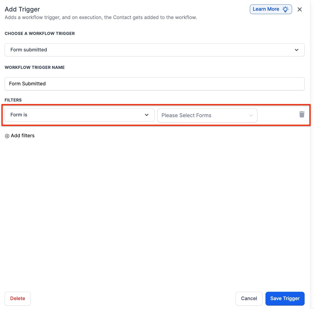 Add a new trigger using the Add New Workflow Trigger option. Customize your trigger with specific filters to define activation conditions.