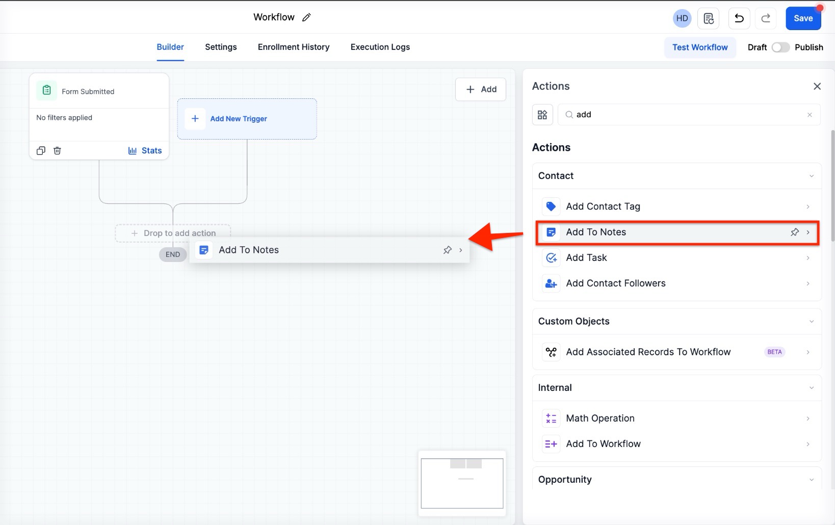 - Test your workflow with the “Test Workflow” button, save changes, and switch from Draft to Publish to activate it.
