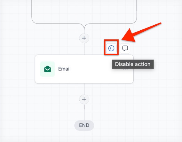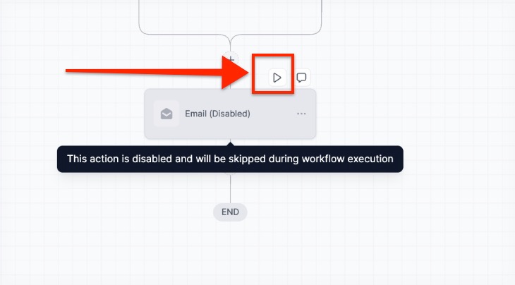 - When an action is disabled, it will appear dimmed and will be skipped during execution. If a paused node is the only path to subsequent steps, the system will bypass the paused action and continue to the next active node in the sequence.