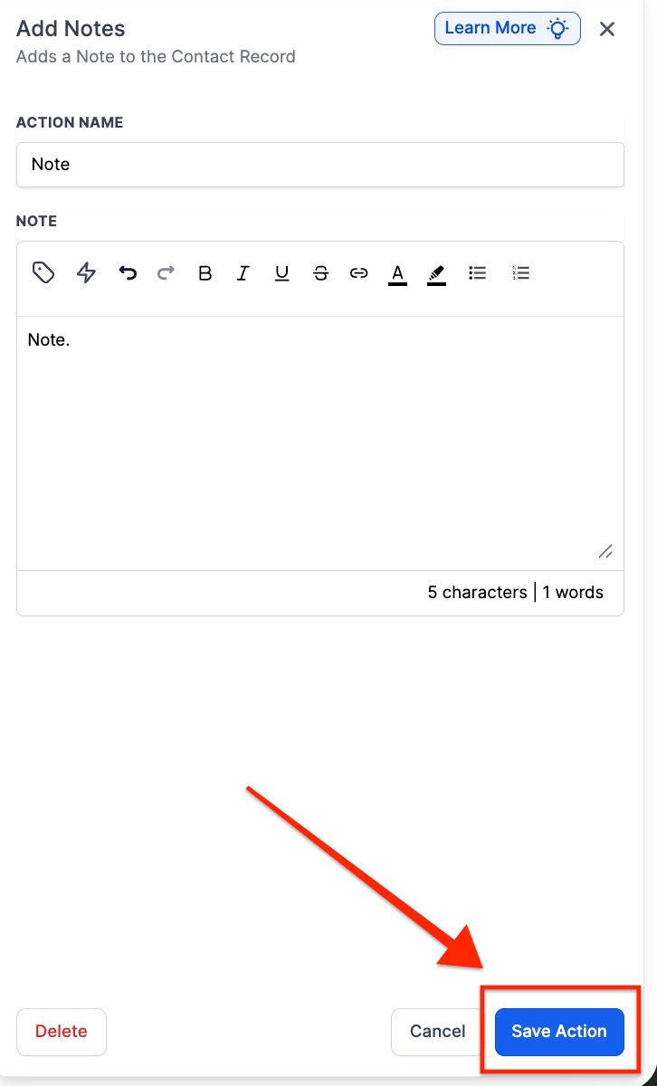 - Once you drop an action into a highlighted spot, the configuration panel will open. After saving the configuration, the action becomes a permanent part of your sequence.