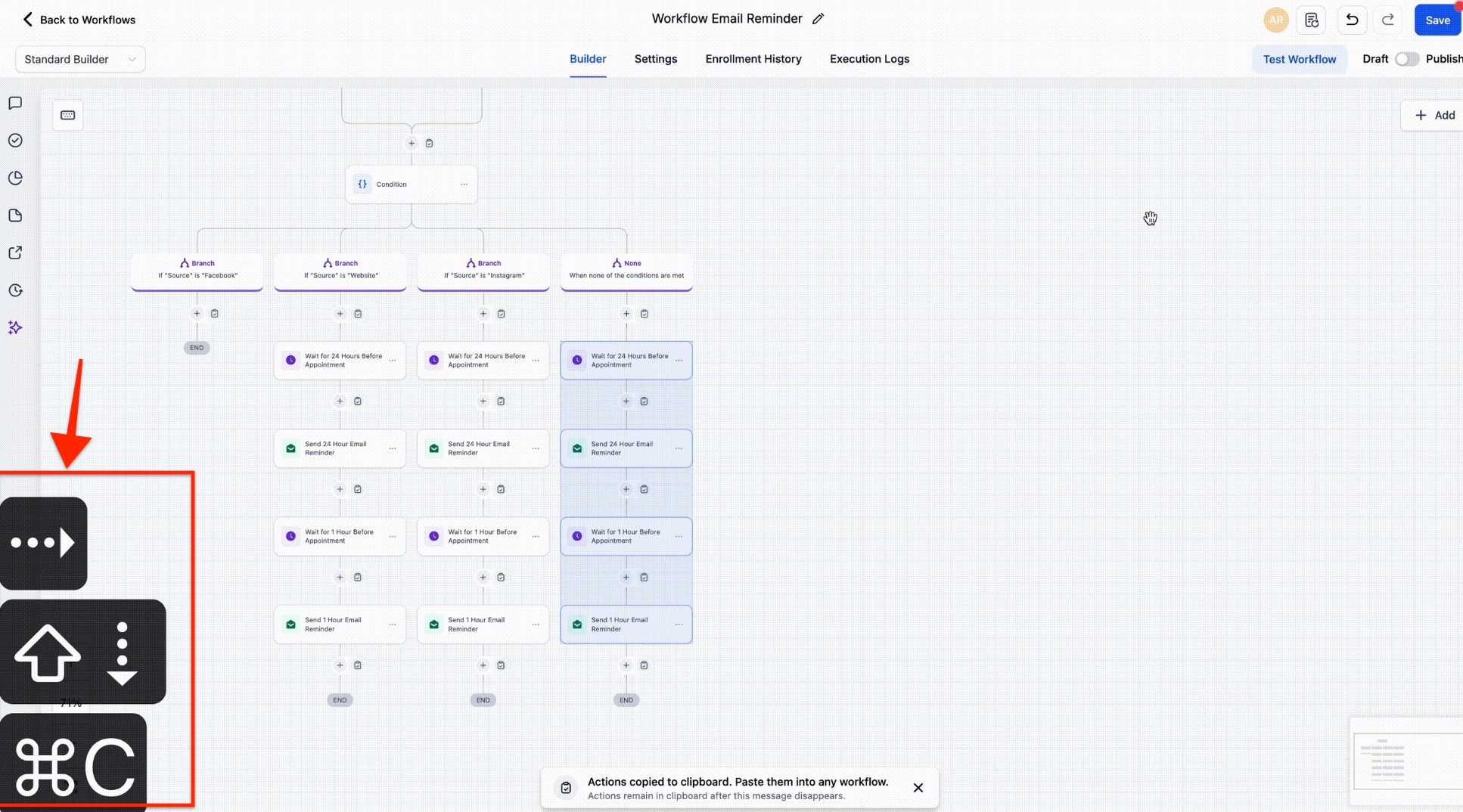Section titled “Keyboard Navigation & Shortcuts”Keyboard shortcuts have been added to the standard workflow builder, allowing you to create, edit, and navigate workflows more quickly using the keyboard. These shortcuts cover node movement, selection, copy and paste, delete actions, zoom controls, panel access, and saving.