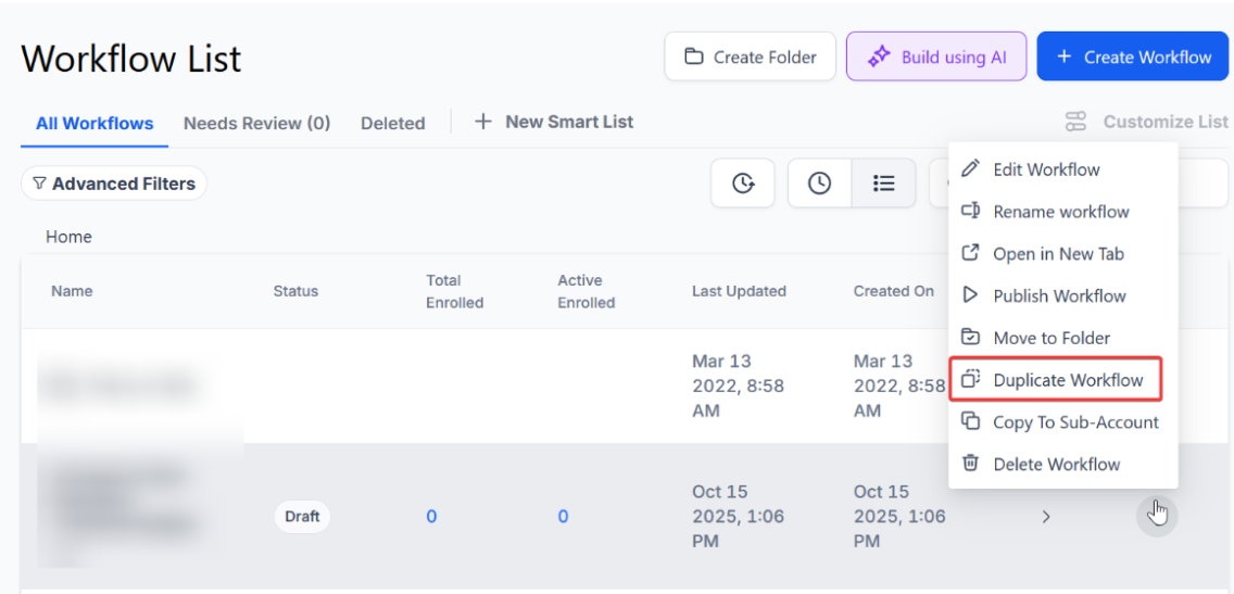 Duplicating a workflow is a helpful feature when you want to either preserve an old workflow but make significant changes or use a workflow as a foundation for a brand new automation.