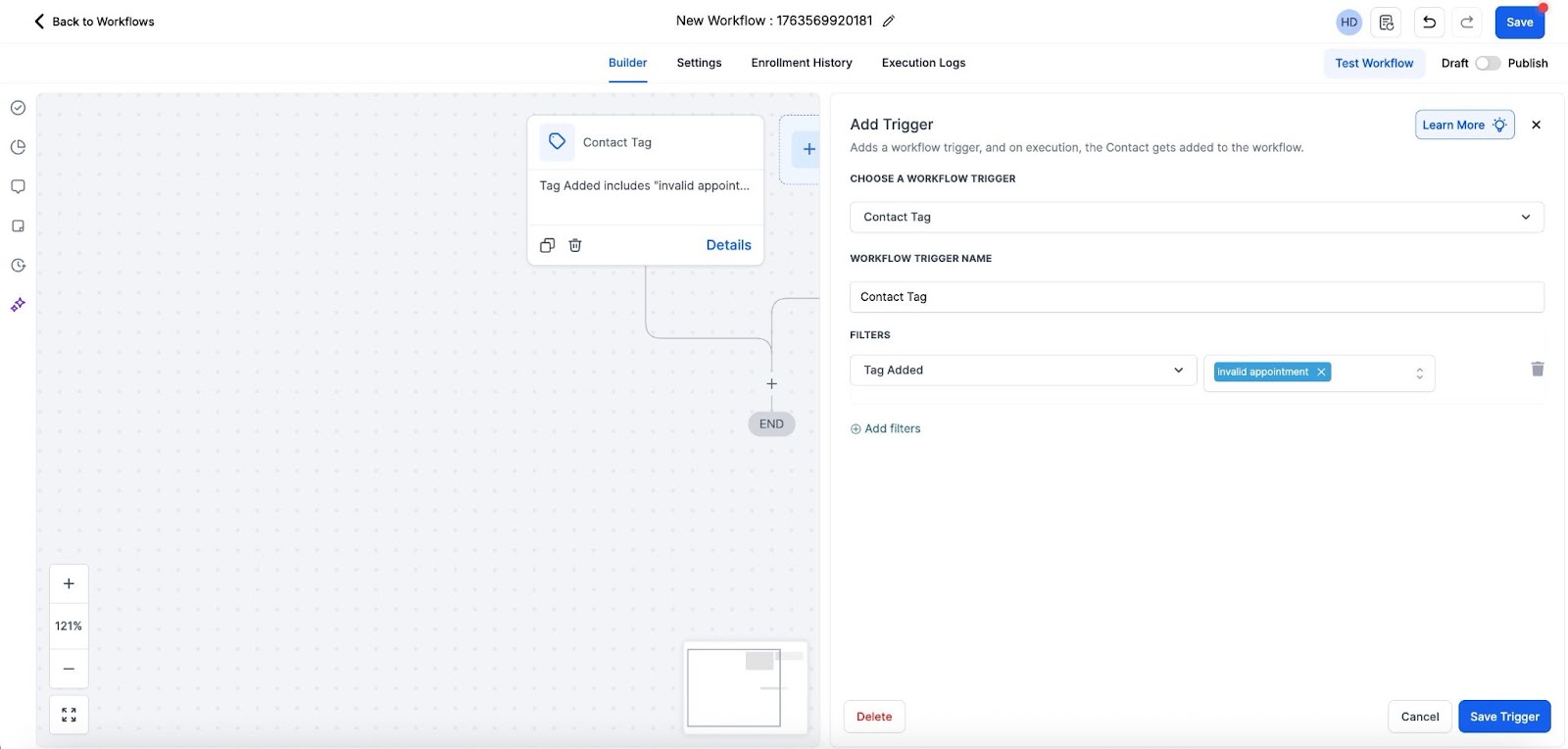 - Add a new Trigger named “Contact Tag,” choose the filter “Tag Added,” and then select the “Invalid Appointment” tag you created. Save the trigger.