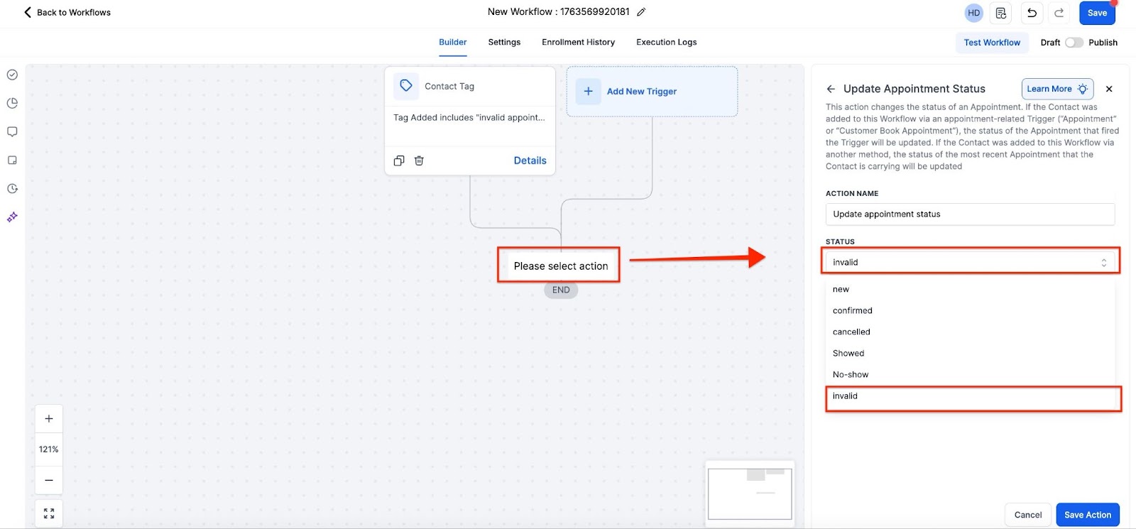 Section titled “Part 3: Using the Tag and Trigger”- When you have contact with an invalid appointment, add the “Invalid Appointment” tag, and the workflow will run, updating their appointment status to “Invalid”.