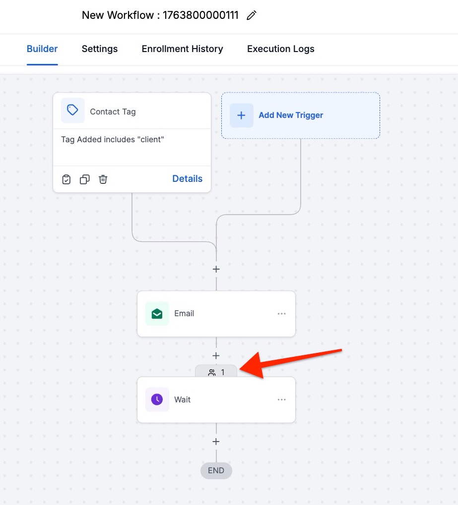 Section titled “Option 1: Delete from the action step”- If a workflow step has a contact on that step, there will be a user icon on the top part of that step. If you click on that icon, a list will pop up that shows all the contacts waiting in that step.