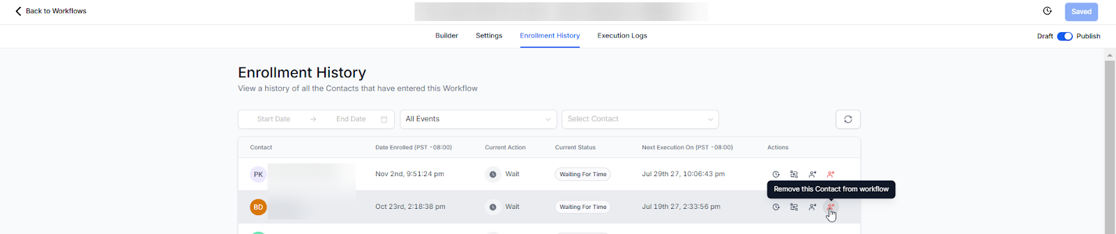Question: Is there a way to view all contacts currently in a workflow and their respective steps? Answer: Yes, the Enrollment History tab provides a complete list of all contacts in the workflow along with the specific step they are currently in, allowing you to manage their movement or removal.