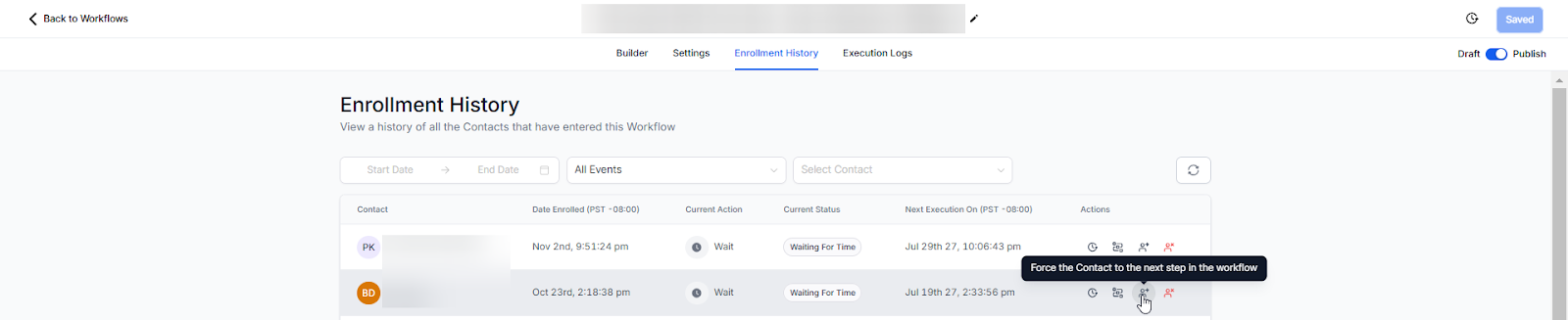 Next to the name and email of the contact, you can click on the Delete button which will remove the contact from the workflow, or the Move to Next Step button to move that contact to the next step in the workflow.