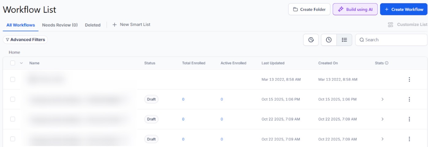 Section titled “Steps to Pause Workflows in”Access the Automation SectionLog in to your account and navigate to the Automation section. Here, you’ll find all your active workflows.