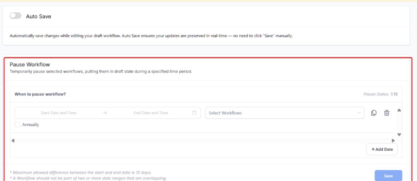 Save the SettingsOnce all configurations are complete, click Save to apply the changes. The selected workflows will now be paused during the specified dates.