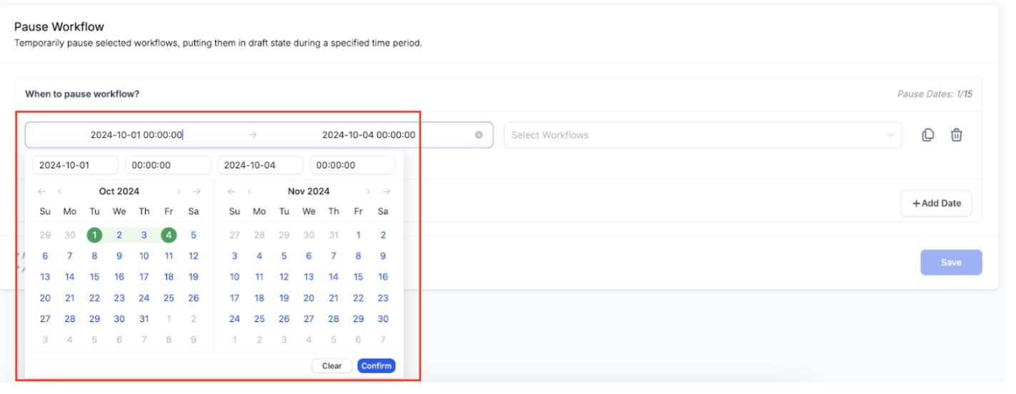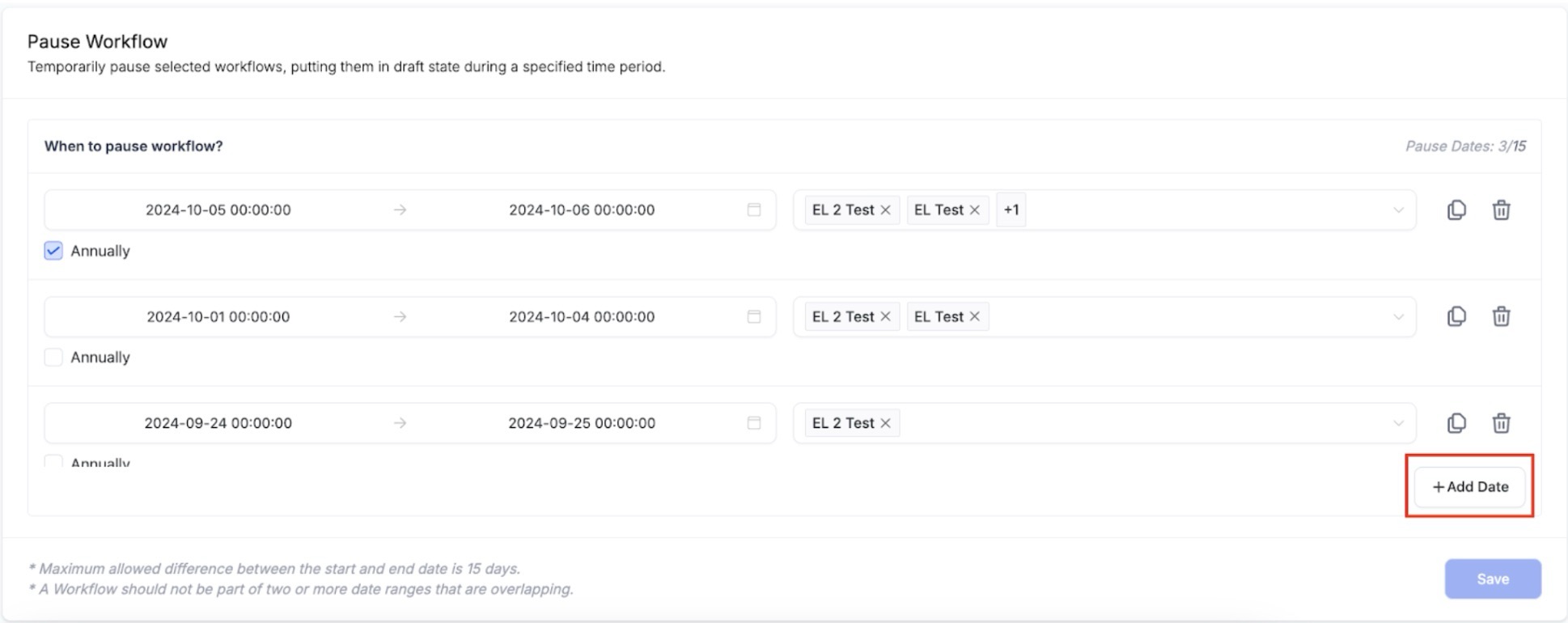 Section titled “Adding Multiple Date Ranges”You can add multiple rows of date ranges by clicking on the “Add Date” button. Currently, users can add up to 15 different date ranges to pause workflows.