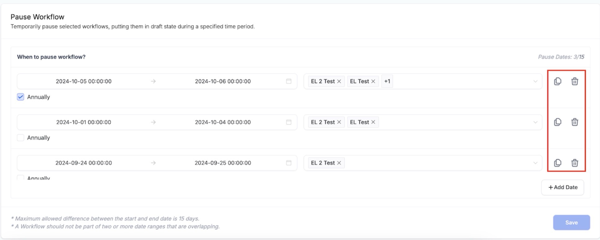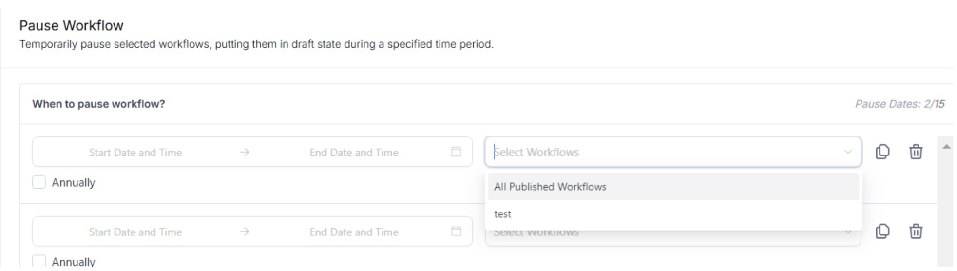 Section titled “Additional Tips”- Duplicating Pause Settings: If you need similar pause settings for different workflows or date ranges, you can duplicate the configurations to save time.