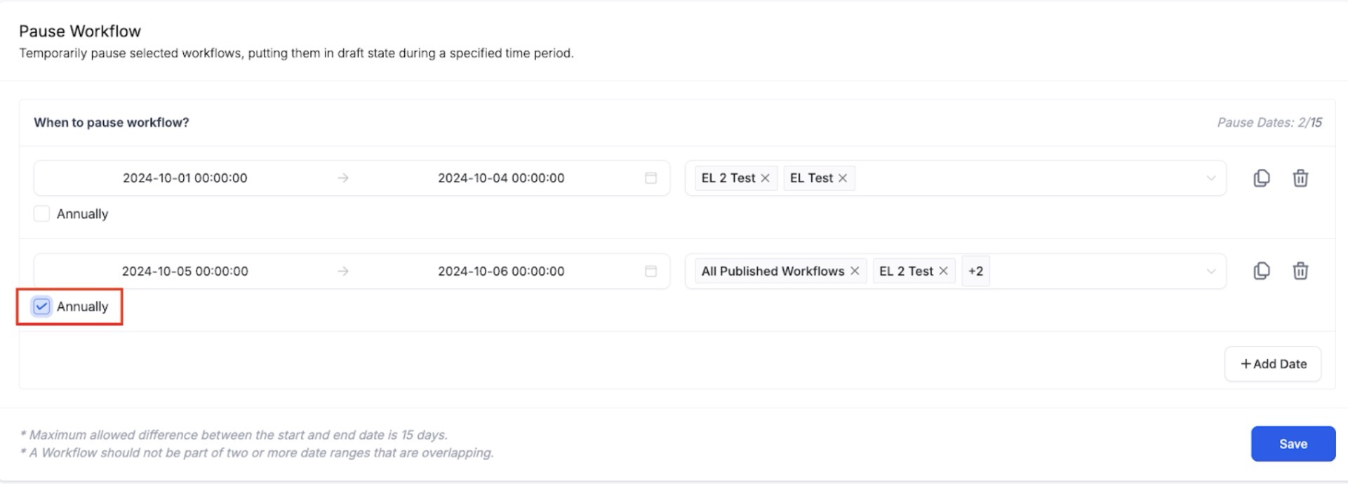 If you want to pause certain workflows on the same dates every year, simply check the “Annually” checkbox available for each row item. Once selected, the workflows will automatically pause for the specified dates every year without requiring further configuration.