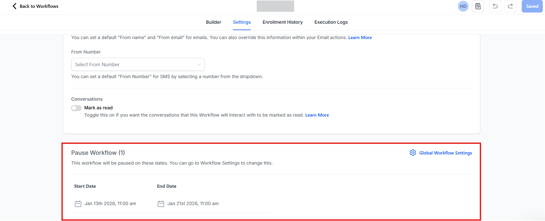 A new section called “Pause Workflow” has been added to the builder settings for each workflow. This section provides details about the date and time when the workflow was paused.