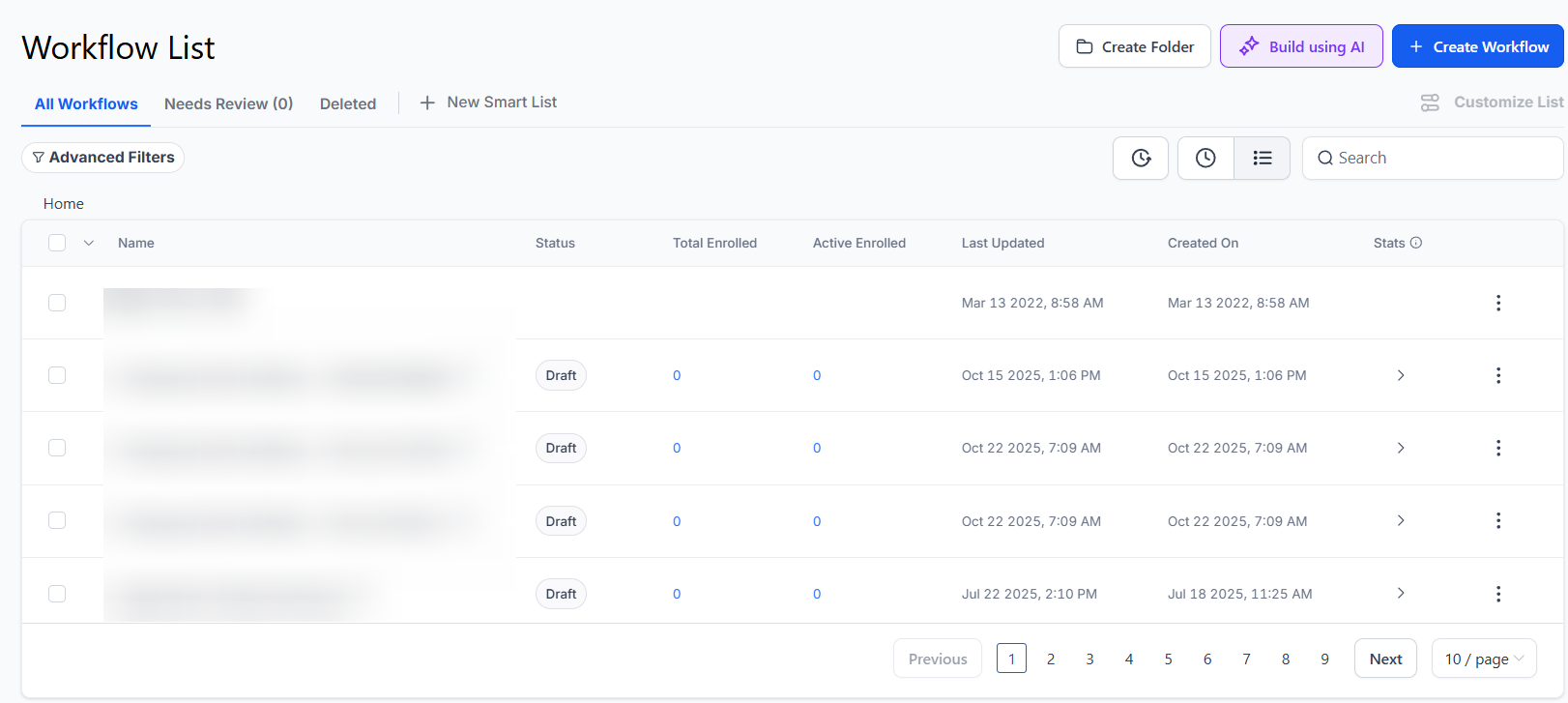 - On the Workflow list page, click on the newly added “Deleted” tab to view all deleted workflows.