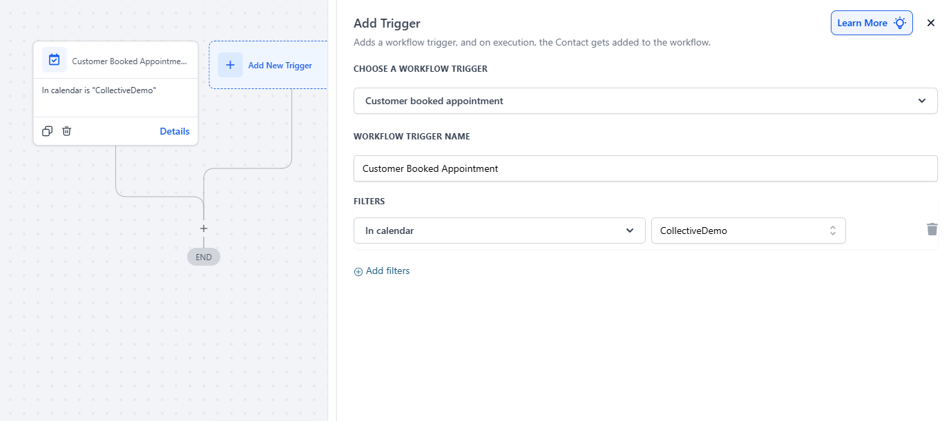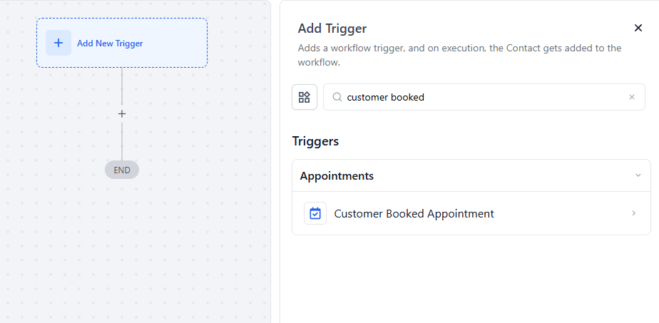 Section titled “Step 2: Select The Trigger and Filter”- Click on Add New Trigger, and choose “Customer booked appointment”