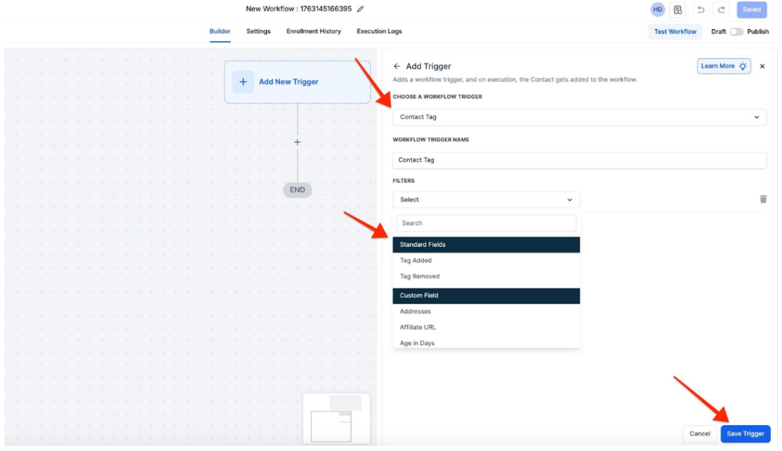- In the Workflow builder, add a trigger for “Contact Tag.”