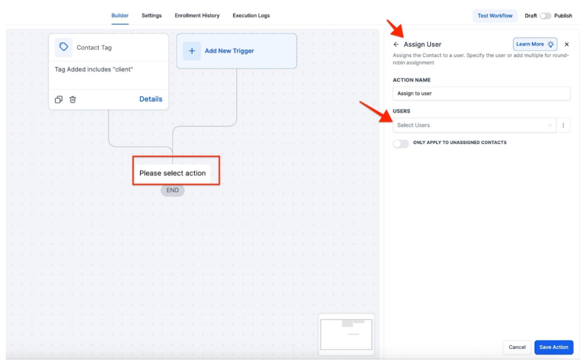- Note: If you don’t specify a tag, the Workflow will trigger on any contact tag, which might not be ideal for your specific needs. Choose the appropriate tag that matches your business use case, such as tags from appointment bookings or tags added to imported contact lists.