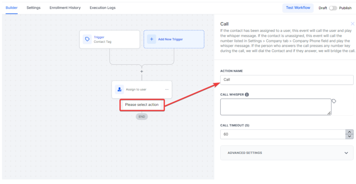 Within the Workflow builder, you can create an automated sequence for making calls and dropping voicemails. Below is a step-by-step guide on setting up this sequence using a tag-based trigger.