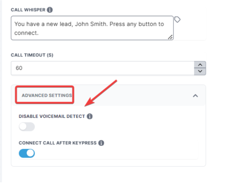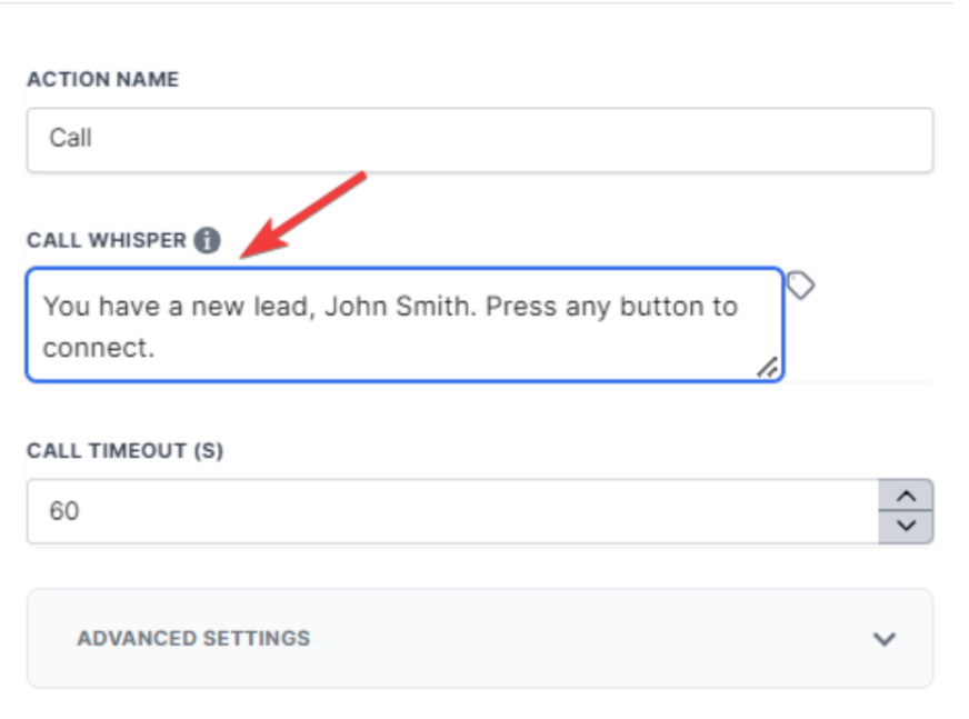 - By default, a call whisper message (a message heard by the answering party) plays, stating: “You have a new lead, John Smith. Press any button to connect.” This message repeats up to three times before connecting the call.