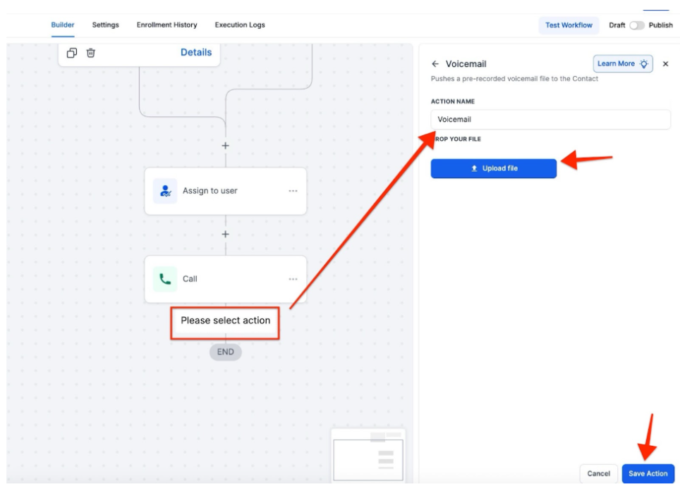 When adding the Voicemail action, ensure you upload the voicemail recording in the correct format (.mp3 or .wav).
