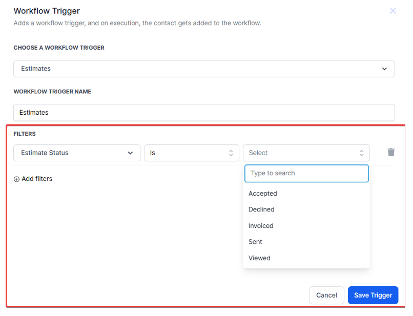 Configure filters to narrow down which estimates should trigger the workflow. You can filter estimates by: