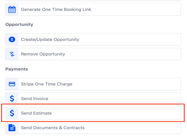 - Send Estimate Action: With this action, estimates can be sent automatically from workflows, reducing the need for manual intervention and speeding up communication with clients.
