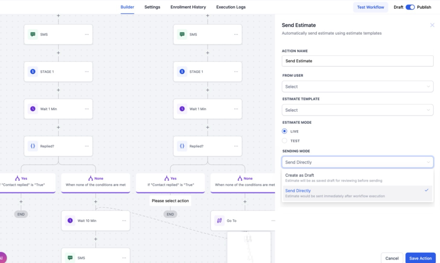 - Select an option from the “Sending Mode” dropdown, either “Send Directly” or “Create in Draft.” With the “Create in Draft” option, each time this workflow is triggered, a draft estimate will be created and placed in the draft section of Estimates.