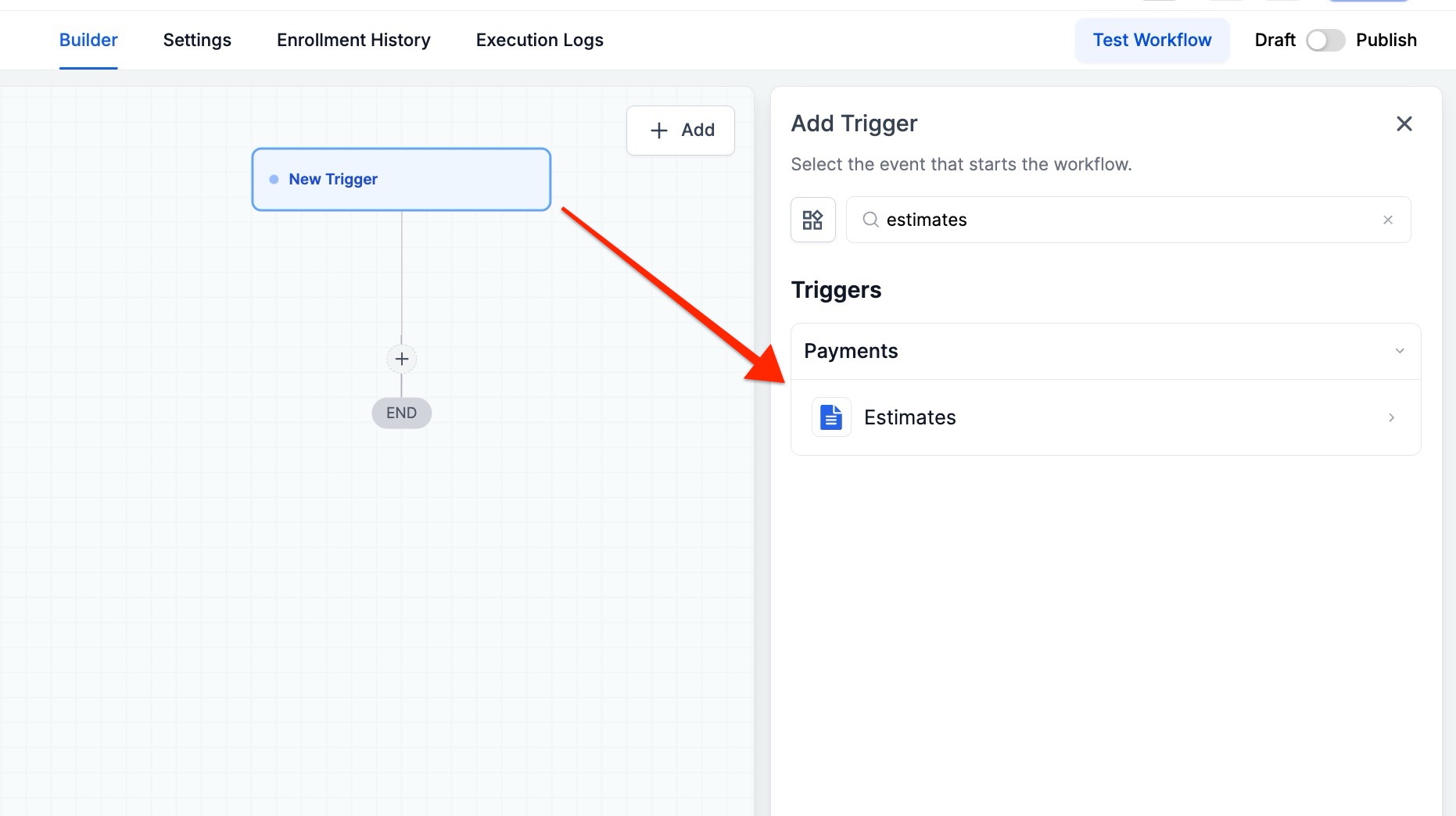 - Choose the “Estimates” trigger from the list of available triggers. This trigger allows you to automate actions based on specific estimate events.