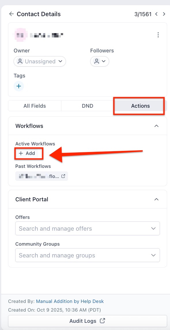 Pro Tip: Testing a workflow organically, as if the contact is real and setting off the trigger, is the best method for trial testing. This approach provides the most accurate simulation of real-world scenarios. You can add a contact to a workflow manually from the contact card of any lead, and depending on the actions inside, it may not behave as expected without using the appropriate trigger.