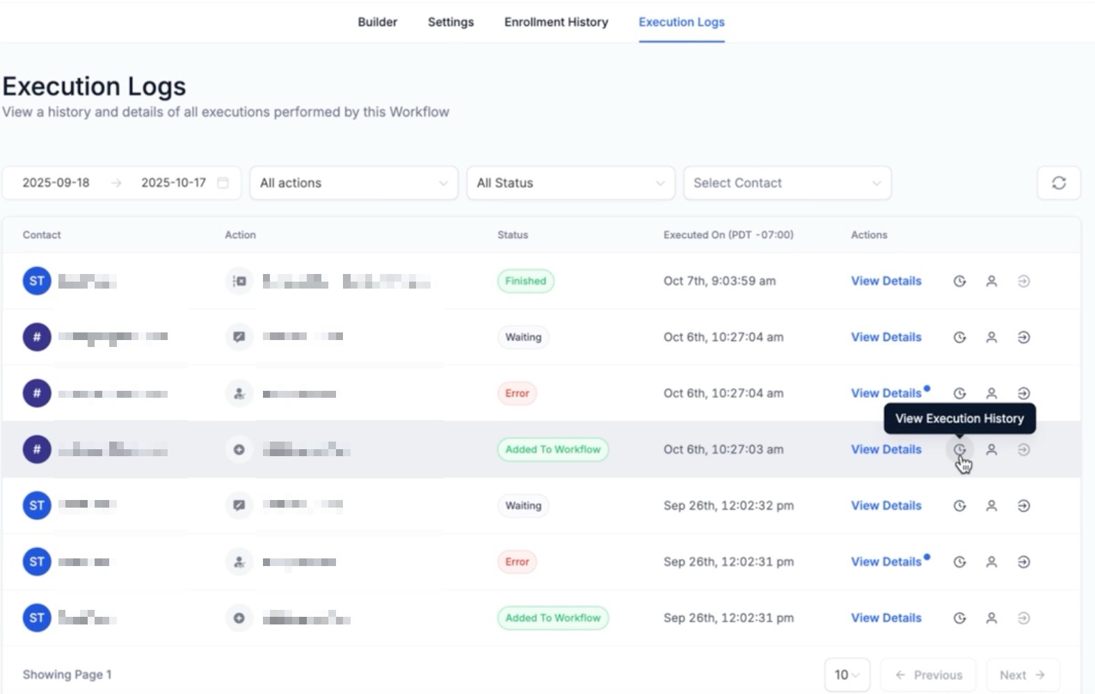 - Click on “View Execution History” for a detailed view of each action, including reasons for any errors.