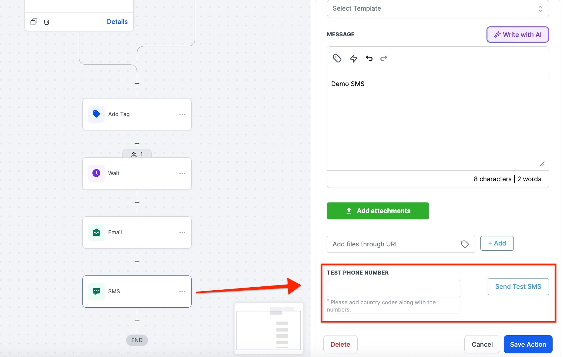 Section titled “Testing SMS Actions”- Use the “Send Test SMS” button to verify message content.