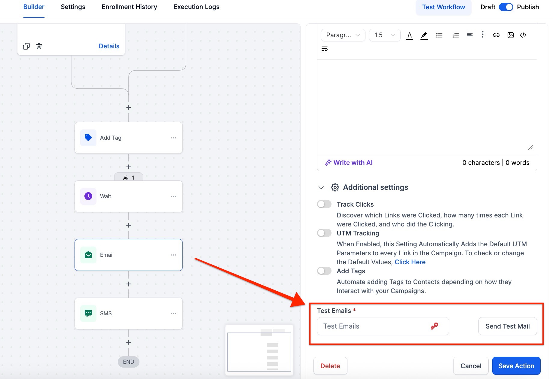 Section titled “Testing Email Actions”- Use the “Send Test Mail” button to check email content.