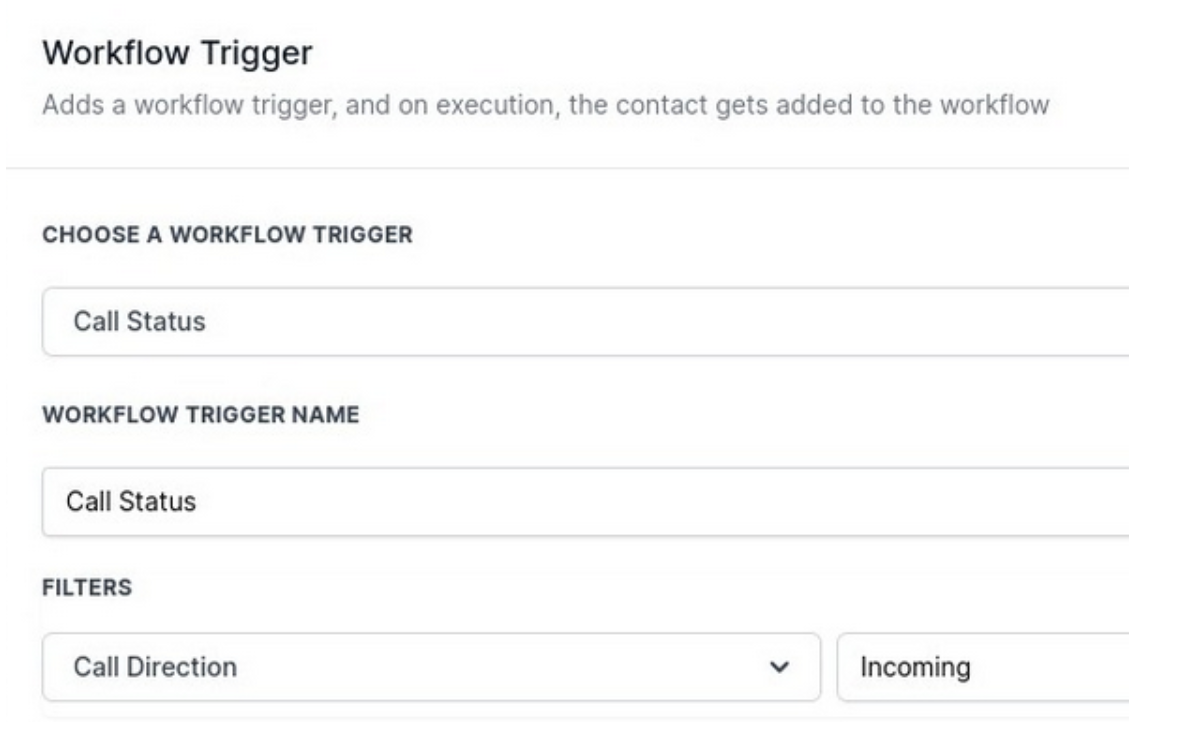 - Set up a Workflow Trigger as Call Status and filter by Call Direction and “Incoming Call.”