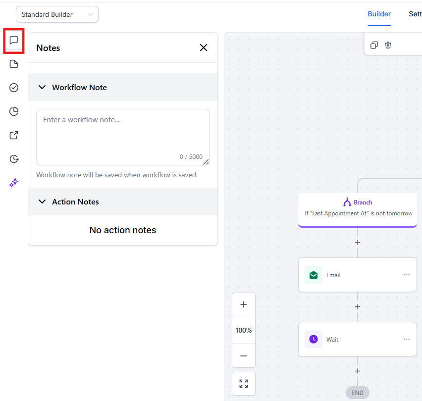 Question: If I have a very long workflow, do I have to scroll to the top to see all my Action-Level Notes? Answer: No. While you can see the notes by hovering over a specific action, all Action-Level Notes are also centralized in the main Notes section of the sidebar for easy review and management.