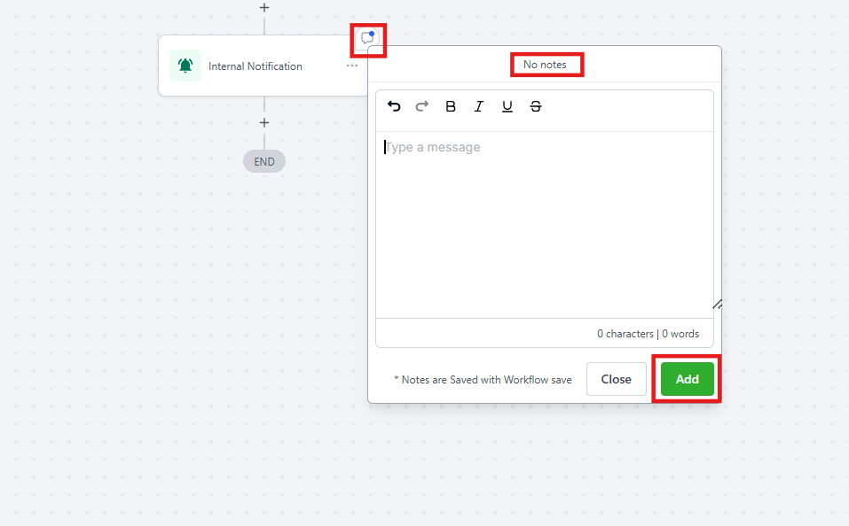 - Notes are automatically saved when the workflow is saved, so no details are lost.